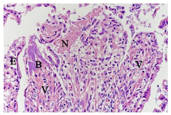 Histological section from small intestine dog with acute haemorrhagic diarrhoea, HE-stain. There was a loss of surface epithelium, necrotic epithelial cells (N), and elongated/stretched epithelial cells (E) trying to cover lamina propria. Note the abundance of bacteria (B) in a necrotic area on one of the villi (V).
