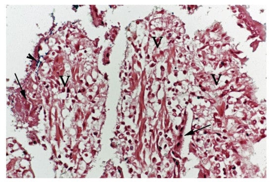 Histological section from small intestine dog with acute haemorrhagic diarrhoea, Gram-stain. Large amounts of small Gram-negative rods (arrows) were located as single bacteria or thick layers close to the surface of the villi (V). Small amounts of large Gram-positive rods (arrowhead) were present in the clusters of Gram-negative bacteria.