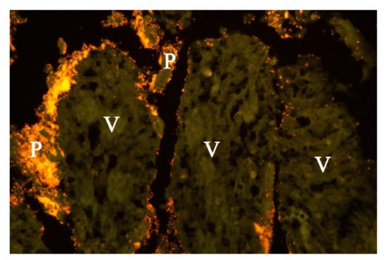 Histological section from small intestine of dog with acute haemorrhagic diarrhoea (a serial section to Figure 5. Providencia alicafaciens was visualised by in situ hybridization using a Cy3 labelled probe. The tissue is orange due to autofluorescence using a red–green double filter set. The Gram-negative bacteria shown in Figure 5 were identified as P. alcalifaciens (P). V = villi.