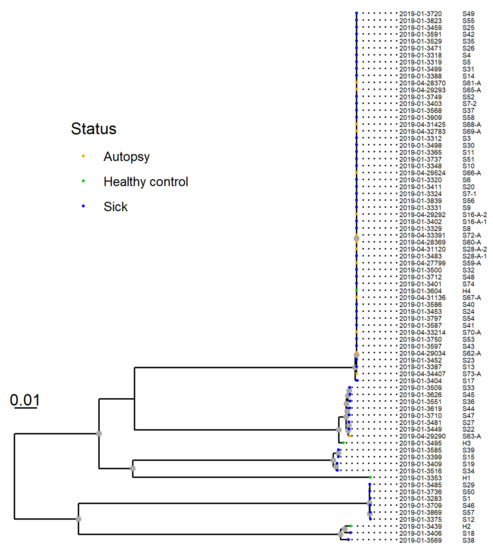 SNP-based phylogenetic analysis of whole genome sequences was performed. A total of two isolates from two diseased dogs were removed from the analysis because they had a considerably greater SNP difference to the other isolates, to the extent that they were unlikely to be associated with the outbreak. When these isolates were included, the high SNP differences lead to such long branches in the phylogenetic analyses that results were difficult to interpret.