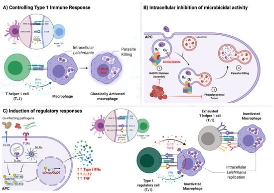 Types of immunological interference with anti-Leishmania responses. (A) A controlling Type 1 immune response occurs when Leishmania antigen presenting cells (APCs) express interleukin-12 (IL-12) to polarize Leishmania-specific CD4+ T cells to T helper type 1 (Th1) cells. Th1 cells express interferon-gamma (IFN-γ) after encountering a parasitized macrophage, which activates anti-microbicidal pathways including predominantly reactive oxygen species (ROS), and compared to murine models, in dogs less inducible nitric oxide synthase (iNOS)-driven reactive nitrogen species (RNS) production by macrophages and killing of intracellular parasites. (B,C) Co-infections may utilize these mechanisms that interfere with a controlling Type 1 immune response described in panel (A); (B) Intracellular pathogens inhibit macrophage microbicidal activity at multiple levels. Inhibition of nicotinamide adenine dinucleotide phosphate (NADPH) oxidase assembly on the phagosomal membrane prevents oxidant generation while production of antioxidants within the phagosome can quench the pathogen damaging effects of ROS. Inhibition of phagolysosomal fusion prevents acidification of the phagosome and release of hydrolytic enzymes contained within the lysosome meant to destroy engulfed pathogens; (C) Co-infecting pathogens can trigger inflammatory cytokine production by APCs via Toll-like receptors (TLRs), Nod-like receptors (NLRs), and C-type lectin receptors (CLRs). Inflammation can trigger induction of regulatory pathways, such as expression of inhibitory receptors including programmed cell death protein 1 (PD-1) and CTLA-4 on Th1 cells and inhibitory ligands on myeloid cells. Inflammation triggers regulatory cytokine production (IL-10 or transforming growth factor beta (TGF-β)) by innate and adaptive cells. Regulatory signals cause Th1 cells to differentiate into Type 1 regulatory cells (Tr1) co-expressing IFN-γ and IL-10. IL-10 antagonizes the activating effects of IFN-γ on macrophages thus negating microbicidal activation and parasite outgrowth. If chronic inflammation persists in combination with prolonged T cell receptor (TCR) signaling, Leishmania-specific Th1 cells further upregulate inhibitory receptors and can become exhausted. Exhausted Th1 cells no longer produce IFN-γ in response to Leishmania antigen, thus macrophages receive no exogenous activation signals, and parasite replication occurs unchecked.