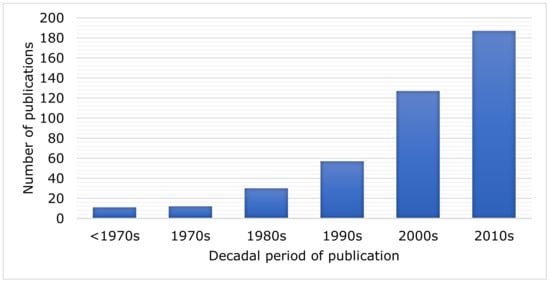 Number of articles published on Corvidae species in urban environments by decade (n = 424).