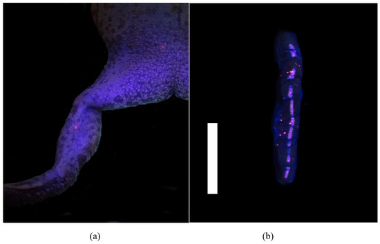 Gross postmortem examination of a marine toad (Rhinella marina) under UV light 9 days after visible implant elastomer (VIE) tag placement in the right distal limb. (a) Pinpoint fluorescent pink VIE is visible at the site of insertion under the skin over the right gastrocnemius muscle and migrated to the right inguinal region. (b) Multifocal pinpoint pink fluorescence throughout the parenchyma of the kidney, indicating systemic migration of VIE (white bar = 1 cm).