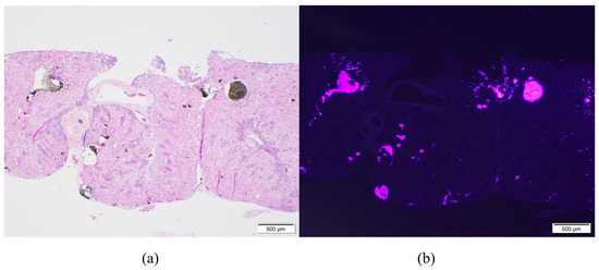 Microscopic examination of the kidney of a marine toad (Rhinella marina) 62 days after visible implant elastomer (VIE) tagging in the right distal limb. 10× magnification shows migrated VIE material in the small vasculature (vasa recta) of the kidney causing distention of the vessels. (a) On standard light microscopy, VIE is characterized as dark granules while under UV light (b) the VIE material fluoresces pink.