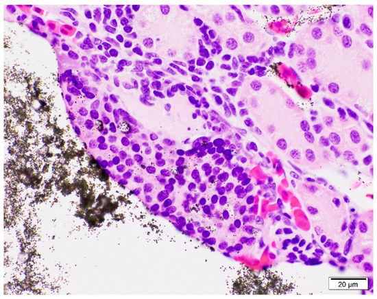 Microscopic examination of the kidney of a marine toad (Rhinella marina) 62 days after visible implant elastomer (VIE) tagging in the right distal limb. 100× magnification shows granulomatous nephritis associated with migrated VIE material in the small vasculature (vasa recta) of the kidney. Phagocytosis of VIE granules, visible within the surrounding macrophages, provides further evidence for the inflammatory reaction to the VIE material in the kidney.