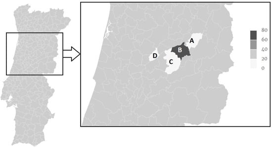 Distribution of F. hepatica IgG seropositivity Serra da Estrela sheep sampled in the years 2015 and 2016 in Celorico da Beira (A), Gouveia (B), Seia (C) and Carregal do Sal (D) municipalities.
