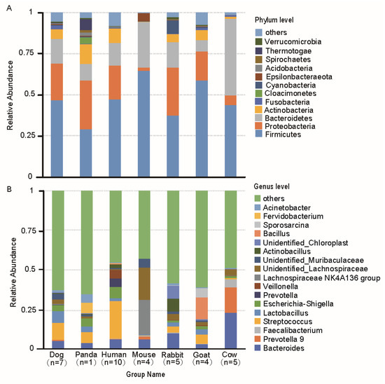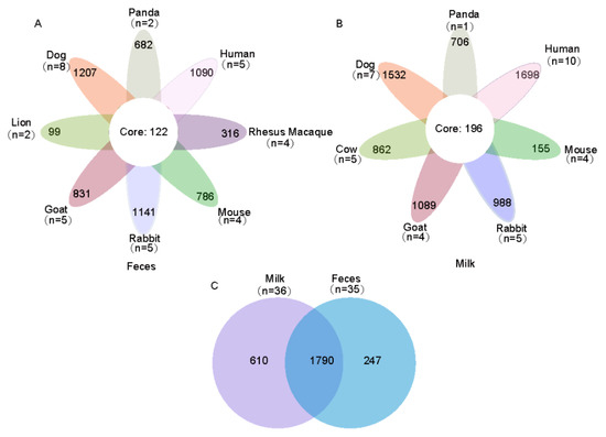 At the initial study visit, we collected recent data (including age, physical condition, diet, and antibiotics), and infant feeding characteristics (breastfeeding, formula, solid foods, and antibiotics). We collected 71 samples from nine mammalian species, including 35 fresh fecal samples and 36 fresh maternal milk samples (see Table S1 in the Supplementary Materials). All neonates’ fresh fecal samples were collected at day 3 after neonatal birth. The fresh fecal and milk samples of giant panda (Ailuropoda melanoleuca), lion (Panthera leo), goat (Capra hircus), and rhesus macaque (Macaca mulatta) were collected at the Chengdu Zoo. The samples of fresh fecal and milk from dog (Canis lupus familiaris), mouse (Mus musculus), and rabbit (Oryctolagus cuniculus) were obtained from the Laboratory of Animal Genetics, Breeding and Reproduction, Sichuan Agricultural University. For human subjects, we recruited healthy mothers and their infants at Sichuan Agricultural University who had not received antibiotics recently. The mothers’ ages at the time of milk sample collection were 25–32 years old. Fecal samples from their infants were collected. Fresh cow milk was used to feed newborn lions, while other animals in this experiment were fed maternal milk. We provided sterilized connectors and sterile bottles. For human participants, maternal milk was expressed into sterile bottles with a breast pump using sterilized connectors. Fresh feces of newborns needed to be quickly placed into a sterile collection tube, and then were stored in a −80 °C freezer until the nucleic acids were extracted.
