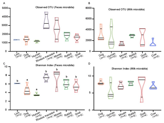 The following are available online at https://www.mdpi.com/article/10.3390/ani11123349/s1, Figure S1: OTU-level alpha diversity of the maternal milk and neonatal fecal microbiota of mammals, Figure S2: Neonatal fecal microbiome compositions of the mammals, Figure S3: The observed OTU (A) and Shannon indexes (B) were compared using Kruskal–Wallis tests to determine significant differences, Figure S4: Principal coordinate analyses based on weighted UniFrac and unweighted UniFrac distances. Bar plots labeled with different letters (a, b, and c) denote that UniFrac distances between and within groups were significantly different (Kruskal–Wallis tests, FDR < 0.05). Table S1: rRNA Gene Sequences of Maternal Milk and Neonatal Feces of Mammals.