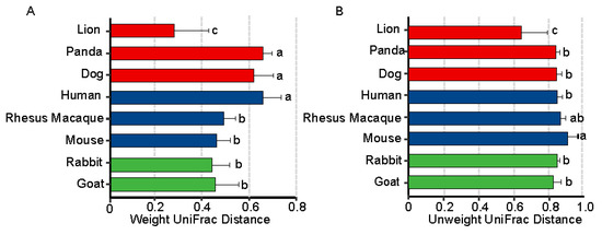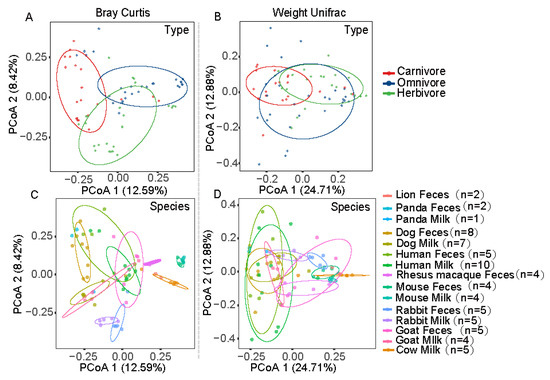 Bray–Curtis-based principal coordinate analysis (PCoA) showed clustering by the three type groups (Figure 4A) and by taxonomic species (Figure 4C). The PCoA plot showed that the three type groups and a phylogeny shift in milk and fecal microbiota were evident in the carnivores, omnivores, and herbivores. However, the samples from lion feces did not cluster together with the samples from the other carnivores, even though lions are carnivores (Figure 4A). Lion fecal samples clustered more closely with cow milk samples than with other carnivore samples (Figure 4A). A similar result was obtained with weighted Unifrac analysis (based on the presence/absence of taxa) (Figure 4C,D).