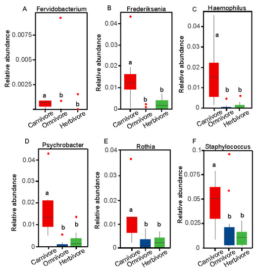Boxplots showing specific differences in the relative abundances of discriminant genera(A-F) between the carnivore, herbivore, and omnivore maternal milk microbiomes (Wilcoxon rank-sum tests, FDR < 0.05).