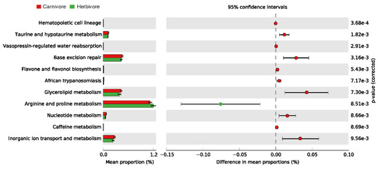 Then, functional prediction by PICRUSt2 identified 11 different enrichment KEGG pathways between the carnivores and herbivores (Figure 7). The carnivore maternal milk had a significantly higher percentage of base excision repair, glycerolipid metabolism, taurine and hypotaurine metabolism, inorganic ion transport and metabolism, and nucleotide metabolism, while arginine and proline metabolism showed enrichment in the herbivore maternal milk.