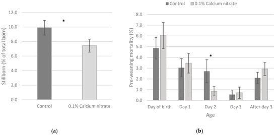 Stillborn percentage (a) and pre-weaning mortality percentage during the first three days of life (b) for piglets born out of sows receiving the control diet or the 0.1% calcium nitrate diet. * Indicates a significant difference (p < 0.05).