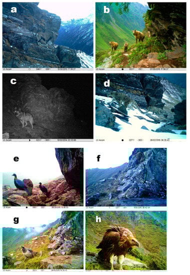 Representative photos of mammals and birds imaged by the infrared cameras in the Wolong National Nature Reserve. Bharal (a), Sichuan takin (b), wolf (Canis lupus) (c), snow leopard (d), Chinese monal (e), snow partridge (Lerwa lerwa) (f), Tibetan snowcock (g), and Himalayan vulture (h).