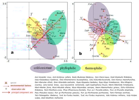 The results of the DCCA are shown in Figure 3. The 12 environmental factors orthogonal to each other form two principal component axes (X, Y), in which the environmental factor arrows are distributed in three main directions (X1, X2, and Y). The X-axis indicates the material environment information that changes with the elevation gradient, with X1 as a geographical factor and X2 as a vegetation factor. The Y-axis indicates the energy environment information that includes temperature-related factors and terrain gradients. The most dominant component of X1 is elevation, and other factors closely related to X1 include the distance between observation sites, water sources, and maximum activity temperature (Tmax on the graphs). X2 includes herbal vegetation coverage, shrub coverage, and habitat type. The opposite directions of X1 and X2 indicate that alpine vegetation coverage decreases with an increase in elevation. The angles among the factors on the Y-axis are less than 90 degrees, indicating positive relationships between these factors. Aspect, slope, and minimum activity temperature (Tmin on the graphs), which are close to each other, are relatively accordant with the principal component Y-axis (Figure 3a). In Figure 3b, aspect and minimum activity temperature are close and mostly accordant with the Y-axis, while slope could be partly projected to the reverse extension line of the Y-axis. Aspect and slope are related to energy balance by sunlight. Ambient temperature is directly related to the energy of the biological activity and metabolic processes of the individuals [16]. Therefore, the minimum activity temperature is one of the key environmental factors for the observed wildlife in alpine ecosystems.