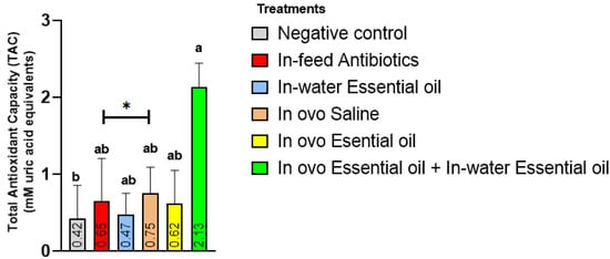 Effect of essential oil delivery route on broiler chicken’s total antioxidant capacity (TAC). Bar charts with different letters a, b differ (* indicates a significant difference at p < 0.05).