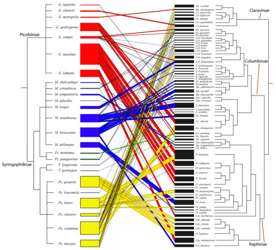 To visualize host phylogeny, a tree of the columbiform species was constructed based on a consensus avian phylogenetic tool available at http://birdtree.org/ (accessed on 5 March 2019) [71]. As the source of our consensus tree, we used the ‘Hackett All Species tree’ with 1000 randomly generated trees. The most credible tree was then determined using the tool TreeAnnotatorv1.8.2 in the software BEAST v1.8.2 [72]. The consensus tree was then graphically adjusted in FigTree v1.4.2 (Andrew Rambaut, University of Edinburgh, UK; http://tree.bio.ed.ac.uk/software/figtree/ (accessed on 5 March 2019)).