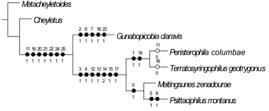 In the cladistic analysis, we examined relationships at the generic level. All operational taxonomic units (OTUs) were represented by taxonomic species, i.e., type species for each genus. A free-living predator Cheyletus eruditus (Schrank) and quill-inhabiting predator Metacheletoides numidae Fain both belonging to the sister family Cheyletidae, were used as outgroups in the analyses. Because each particular syringophilid genus is represented by a single species in the present analysis, the character states appearing as autapomorphies represent true synapomorphies for genera.