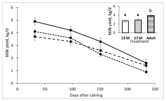 Milk production from pregnant heifers at 15 months (••••), 27 months (– – –) and multiparous cows (–––) until weaning. Different letters indicate difference between means is significant (p < 0.05) between treatments. Values are means ± SEM. Treatment, p = 0.03; time, p < 0.0001; treatment × time, p = 0.94.