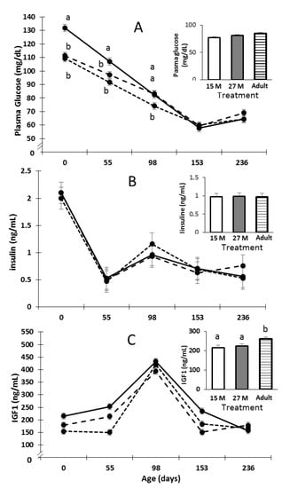 Calves born from adult dams had higher fasting blood glucose concentration compared to calves from 15 M and 27 M dams from birth to 55 d and to 89 days of age, respectively (p < 0.05; Figure 2A). After 55 days of age, calves from 27 M and adult dams had higher glucose concentration with respect to 15 M dams, but no differences between groups were observed from 153 to 236 days of age. Serum insulin concentrations from birth until weaning at 236 d of age were not affected by treatment (p = 0.99; Figure 2B). Serum IGF1 concentration was increased in calves from adults cows compared to that in calves from 15 M and 27 M dams from birth to weaning (p = 0.01; Figure 2C).