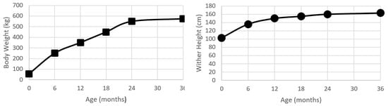 Despite the Thoroughbred often being touted as an early maturing breed compared to other horse breeds, the pattern of growth and attainment of a near final wither height is very similar across all horse breeds [10,30], even within heavy draft crosses bred for meat production [32]. The pattern of growth between cohorts of Thoroughbred, Selle Francais, and French Trotter horses showed a remarkable similarity, with a near flattening of the growth curve reported at 2 years of age [29]. A similar agreement in wither height growth curves between Thoroughbred, warmblood, and crossbred horses was modelled by McManus, et al. [33]. In the Lipizzaner, mature height was estimated to have been achieved slightly later by 27 months of age [34].