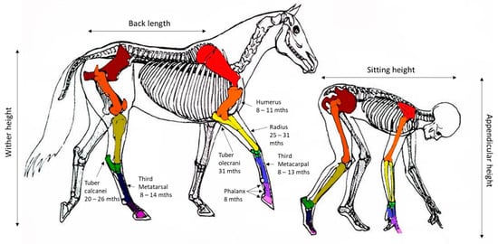 - Thompson, K.N. Skeletal growth rates of weanling and yearling thoroughbred horses. J. Anim. Sci. 1995, 73, 2513–2517. [Google Scholar] [CrossRef] [PubMed]