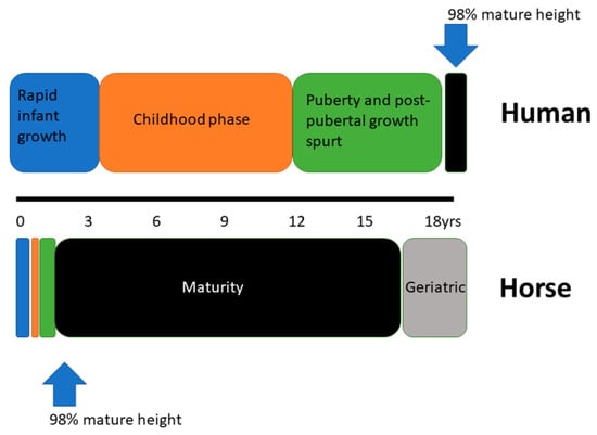 Schematic representation of the three periods of growth in human and equine development and the relative age at attainment of skeletal maturity.