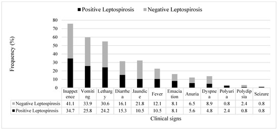 Frequency (%) of clinical signs observed in the dogs diagnosed with kidney and/or liver disease with leptospirosis (black bar) and without leptospirosis (grey bar) that had presented to hospital or private clinics (n = 124).