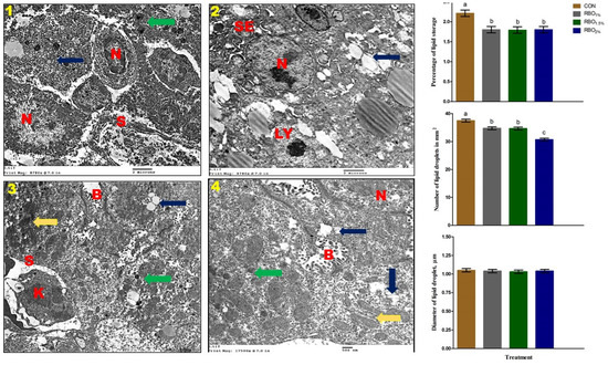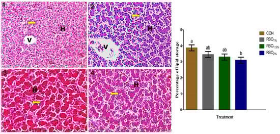 52]. No pathological lesions were observed in the broiler chickens’ livers of the current experiment. The lipid content of the experimental groups whether assessed using images from light or electron microscope revealed that RBO feeding linearly decreased the percentage of hepatic lipid storage and number of lipid droplets compared to control. Regarding the hepatic chemical assessments, the broiler chickens consumed the RBO diets had significantly lower liver cholesterol, triglycerides, and MDA contents when compared with those consumed the control diet. The liver plays a central role in lipogenesis in birds, and contrary to mammals, the fat synthesis occurs mainly in the liver and is restricted in the adipose tissue [
