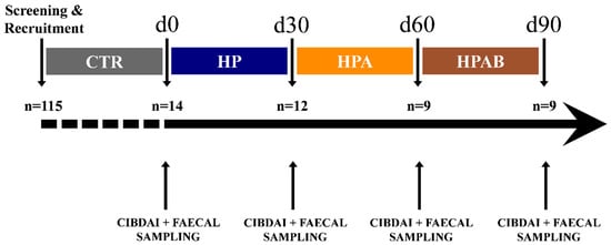 Throughout the study, the patients did not receive any other additional foods or pharmacological treatments. Canine IBD activity index (CIBDAI) [] evaluation, along with faeces collection, were performed at four distinct time points, i.e., prior to study initiation (d0), at its end (d90), and right before each treatment switch (d30, d60), as summarised in Figure 1. Freshly voided stool specimens were aliquoted into two parts, whereof one was immediately suspended in DNA/RNA Shield™ solution (Zymo Research, Irvine, CA, USA) for microbiota analysis and the other collected into air-tight disposable containers (Aptaca, Canelli, Italy) for faecal biochemistry assays. Faecal samples were transported at refrigeration temperature (+4 °C) to the laboratory and frozen at −80 °C until analysed.