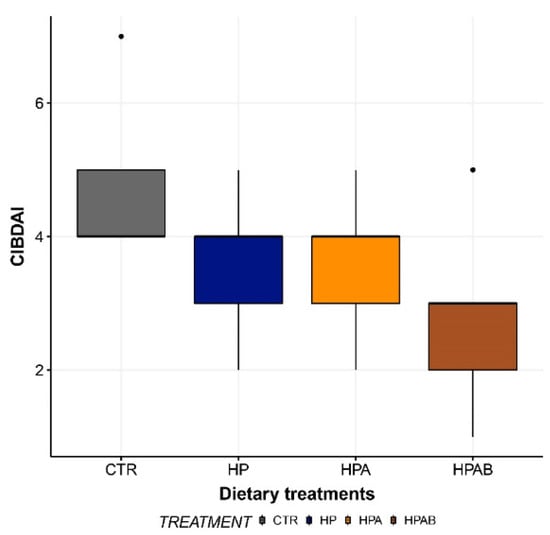 Canine Inflammatory Bowel Disease Activity Index (CIBDAI) score before the initiation of the study (CTR) and at the end of each dietary treatment. Data are represented as box and whisker plots showing median, quartiles, range, and outliers. CTR: Control diet; HP: Hydrolysed protein diet; HPA: Ascophyllum nodosum-supplemented HP diet; HPAB: B. subtilis C-3102 fortified HPA diet.