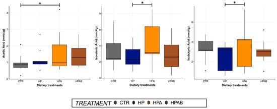 Faecal concentrations of acetic, isovaleric and isobutyric acids before the initiation of the study (CTR) and at the end of each dietary treatment. Data are represented as box and whisker plots showing median, quartiles, range, and outliers. Asterisks indicate statistical significance (p < 0.05). CTR: Control diet; HP: Hydrolysed protein diet; 2) HPA: Ascophyllum nodosum-supplemented HP diet; HPAB: B. subtilis C-3102 fortified HPA diet.