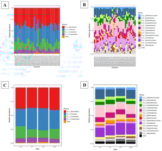 (A) Bar plot of the main phyla detected in faecal samples; (B) Bar plot of the main families detected in faecal samples; (C) Bar plot of the main phyla described for each dietary treatment; (D) Bar plot of the main families described for each dietary treatment.