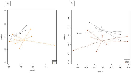 Dissimilarities in faecal microbiota composition represented by the non−metric multidimensional scaling (NMDS) ordination plot, with Bray−Curtis dissimilarity index calculated on unscaled OTU abundances. The centroids of each dietary treatment are features as the treatment name on the graph (‘env_fit’; Vegan R package). Faecal samples collected from CTR vs. HPA diets (A) and from CTR vs. HPAB diets were compared (B). Samples are coloured according to the dietary treatment: CTR (control diet, grey), HPA (hydrolysed protein diet + Ascophyllum nodosum; orange) and HPAB (hydrolysed protein diet + Ascophyllum nodosum + B. subtilis C-3102; brown). Larger filled circles indicate treatment centroids.