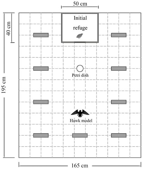 We measured boldness and exploration continuously in an open arena (195 cm long, 165 cm wide, 150 cm high), which was a rectangular field surrounded by gray opaque curtains (Figure 1). A camera (Sony HDR-CX510, 55× extended zoom, Sony Corporation, Tokyo, Japan) was placed above the arena to record the behaviour of the quail. An opaque cardboard box (the same as the housing container; hereafter, referred to as the initial refuge) was fixed outside the middle of one end of the arena. There was a sliding trapdoor (15 cm × 15 cm) on the side of the initial refuge facing the arena. The experimenter could remotely pull the fishing line tied to the trapdoor to allow the quail to walk from the initial refuge to the arena without interference. The ground of the field was divided into 143 squares (15 cm × 15 cm), marked by dark lines. There was a Petri dish (same as that in the housing container) with 20 artificial plant leaves (red and green; 3 cm long, 2 cm wide), 30 cm in front of the trapdoor. The rest of the field was equipped with nine novel objects, not allowing quails to thoroughly view the arena at an immediate glance. To avoid potential habituation to the objects, we used novel materials with the same shape (triangular Decca; 20 cm long, 10 cm high) but different colours that is, white, red, and blue, in the three repeated trials. Materials of different colours were scattered in the same configuration for different subjects. As boldness measures individuals’ willingness to enter an environment with potential predation risk [,], we simulated the risk of predation presented to the quails using a hawk model (26 cm wingspan, 6 cm high, and weighs approximately 50 g), a common predator in the wild. The model was suspended by a fishing line, 90 cm in front of the trapdoor, and the experimenter pulled the model from the ground to a height of 1.5 m.
