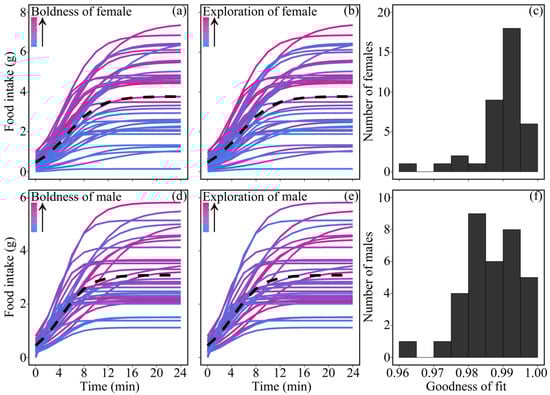Accumulated food intake along foraging time in domestic Japanese quails. Curves in (a,d) were ordered by boldness and those in (b,e) were ordered by exploration. The dark dotted curve in each figure represents the average curve of individuals of the sex. The histograms of (c,f) display how well the accumulated food intake of females and males were fitted by the logistic model.
