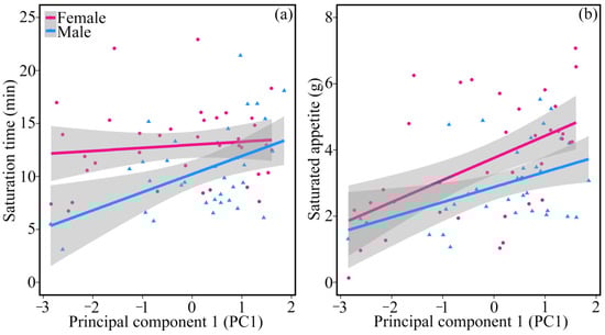 The gain curves of proactive quails were generally above the reactive individuals in the same coordinate system, which indicated that proactive individuals ate more food than reactive individuals (Figure 2). The saturation time (t = 2.394, p = 0.020; Figure 3a) and saturated appetite (t = 4.937, p < 0.001; Figure 3b) were positively correlated with PC1, indicating that, compared with reactive individuals, proactive ones would be saturated after a longer time and consuming a greater amount of food. Females had a longer saturation time (t = −1.787, p = 0.079) and a larger saturated appetite (t = −1.756, p = 0.084) than males. The correlation between PC1 and periodic food intake varied over time (t = −7.577, p < 0.001) and was sex dependent (t = −7.109, p < 0.001). The correlation was significant during early foraging, but non-significant during later periods in females. The pattern was the opposite in males (Table 2).