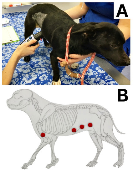(A). Picture showing the thermal threshold (TT) assessment in a dog after surgery. (B). Red bullets showing the body areas where the TT was assessed in each animal. They represent the left lateral humerus area and bilaterally at the T10, T13 and L3 dermatomes.
