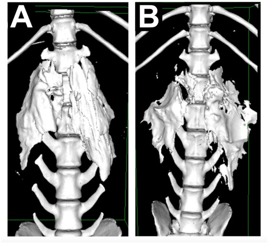 (A) CT image showing the contrast distribution in a dog just before surgery. (B) CT image of the same animal after surgery.