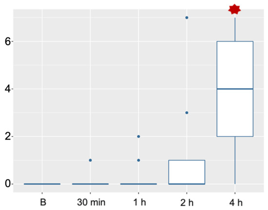 Pain score values taken the day before surgery (B) and 30 min, 1, 2 and 4 h after surgery. Statistical difference was just found 4 h after surgery, where the median of pain score values was 4.