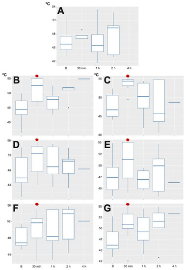 Thermal Threshold results found in the different body areas. (A) humerus (control body area), where no differences were found at any time; (B) (left T10 dermatome); (C) (right T10 dermatome); (D) (left T13 dermatome); (E) (right T13 dermatome); (F) (left L3 dermatome) and (G) (right L3 dermatome) show statistical difference just 30 min after surgery.