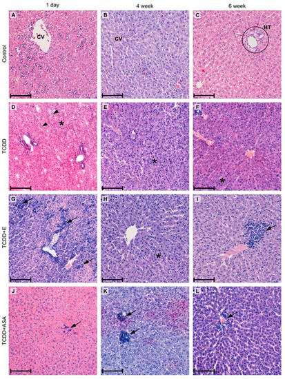 Histopathological changes in the liver of the progeny of TCDD-treated female rats: CV—central vein; HT—hepatic triad; asterisk—impaired architectonics and hepatocytes with hyperchromatic nuclei; arrowhead—basophilic vacuoles in the cytoplasm of hepatocytes; arrow—infiltration of mononuclear cells. Scale bar (A–L) = 100 µm.