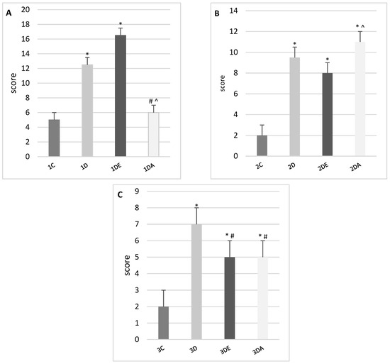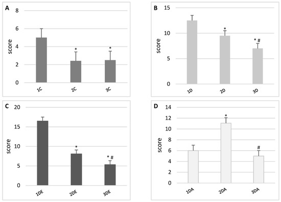 Scoring of histopathological changes in the livers of offspring from TCDD-treated female rats and their progress in time (1—first day of birth; 2—fourth week after birth; 3—sixth week after birth) in groups: (A) control, (B) TCDD, (C) TCDD + E, and (D) TCDD + ASA. Data are presented as mean ± standard deviation. Statistically significant differences (p < 0.05) are marked as follows: * in comparison to first day of birth, # in comparison to fourth week after birth.