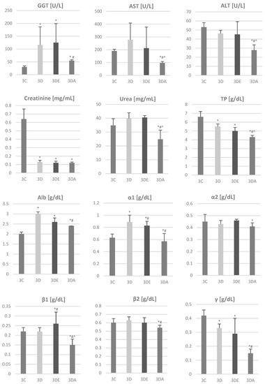 Concentration of selected biochemical markers of liver and kidney function, such as gamma-glutamyltransferase (GGT), aspartate aminotransferase (AST), alanine aminotransferase (ALT), creatinine, urea, total protein (TP), albumin (Alb), globulins (α1, α2, β1, β2, γ) in the blood of rats’ offspring from groups 3C, 3D, 3DE, 3DA. Data are presented as mean ± standard deviation. Statistically significant differences (p < 0.05) are marked as follows: * in comparison to control group, # in comparison to TCDD group, ^ in comparison to TCDD + E group.
