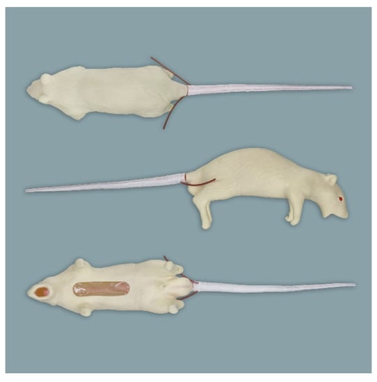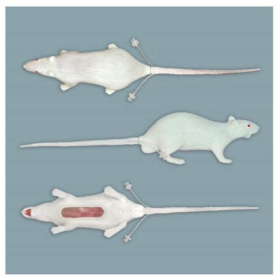 Rat simulator E (Figure 5) is a white silicon rat simulator with four flexible limbs, independent toes and a detachable tail with two lateral blood vessels for intravenous application and blood sampling. The head has solid red eyeballs. In addition, it is equipped with a movable spinal column and flexible skin for various techniques, including handling, restraint, subcutaneous and intramuscular administration as well as microchipping. Its oral cavity houses upper and lower incisor teeth, a tongue and a hard palate and provides training of oral administration. In addition, it has an anal opening for temperature measurements using a thermometer.
