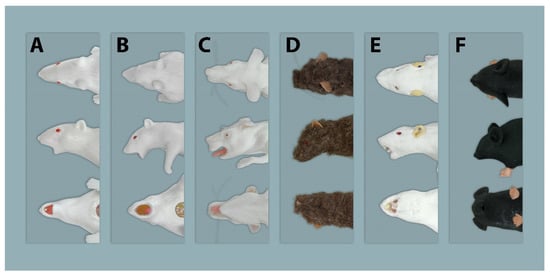 Dorsal, lateral, and ventral view of the heads of all evaluated simulators. (A–E) = Rat simulators; (F) = Mouse simulator.