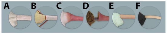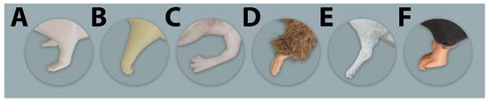 Lateral view of the forelimbs of all evaluated simulators. (A–E) = Rat simulator A–E; (F) = Mouse simulator.