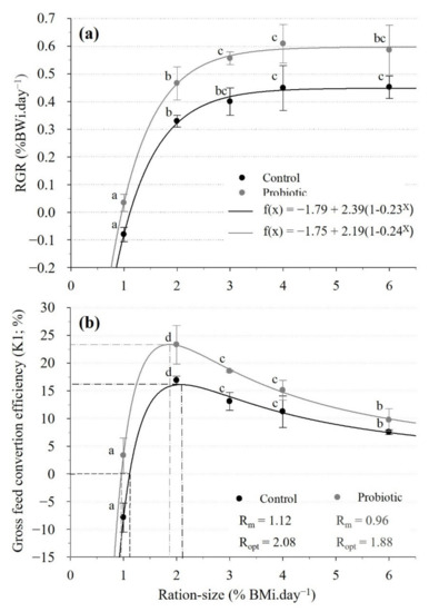 The experimental design did not allow for quantifying the shrimps’ individual feed consumption. Thus, we cannot obtain nutritional parameters at the individual level. However, the overall consumption of the ration provides a measurement of the feed consumption of the shrimps at the tank level. Then, in order to determine the correct parameters to follow, we considered a growth–ration model according to RGR means per tank. For each dietary treatment (control and probiotic diet), the relationship between RGR and ration size was analysed with a non-linear regression and GR curves were plotted. The regressions were calculated to fit the data within the range of the ration sizes (1% to 6%). The model describing the response was: (1) GR: y = y0 + a(1 − bx), where y is the tank average RGR, x is the ration ingested, and a, b are constants determined by the regression. Furthermore, values of K1 in relation to ration size were plotted (KR curve) by using the predicted values from the growth–ration model: (2) KR: y/x = (y0 + a(1 − bx))/x.