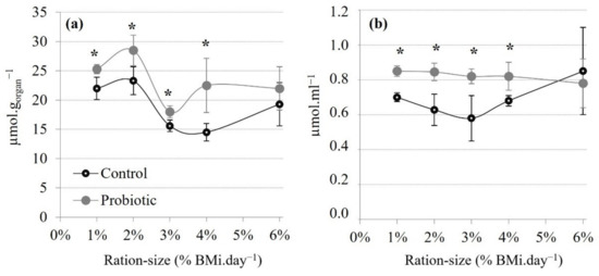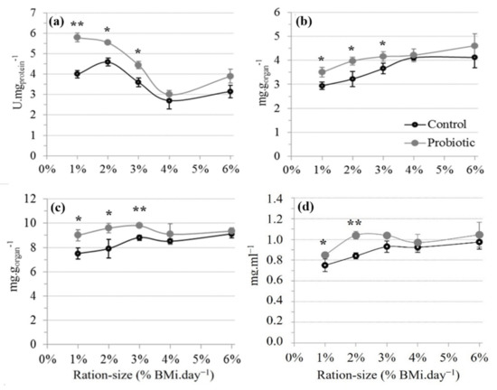 There were significant diet and ration-size effects without interactions on α-amylase specific activity in the digestive gland (Table 7). The specific activity of α-amylase decreased overall with increasing ration size in both diet groups; and significantly higher activities were measured in the probiotic compared to the control groups at ration sizes of 1%, 2% and 3% (Table 7; Figure 2a). There was a significant diet effect and diet × ration size interaction on the specific activity of trypsin in the digestive gland (Table 7). In the control group, trypsin activity decreased with increasing ration size, reaching levels twice lower when fed at 6% compared 1% BM.day−1 (Table 8). In comparison, trypsin activity was not affected by ration size (p > 0.05), instead remaining consistently high in the probiotic group. Variations in the amylase/trypsin ratio were not explained by any of the parameters tested (Table 7). Only one significant difference between treatments was found at 1% ration size, where probiotic fed shrimps showed higher values for this ratio (Table 8).