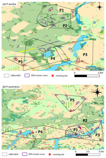 - Kiefer, A.; Veith, M. Untersuchungen zu Raumbedarf und Interaktion von Populationen des Grauen Langohrs, Plecotus austriacus (Fischer, 1829), im Nahegebiet. Nyctalus Neue Folge 1998, 6, 531. [Google Scholar]