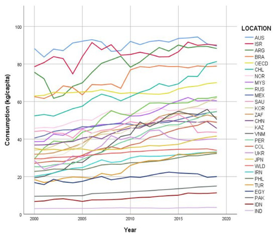 Fish were excluded from our study, and it is important to remember that consumer preferences globally have shifted not only towards higher consumption of poultry, but also fish. The oceanic fish catch and fish-farm production have continued to grow in recent years and reached an all-time record of 178.5 million tonnes in 2018 [54]. Driven by human appetite for seafood, four fifths of marine fisheries are being fished at or beyond their sustainable capacity, resulting in a decline of many species [9,54]. The world now produces more seafood from fish farms than wild catch and, like meat from terrestrial animals, the global production of fish and seafood quadrupled in the last 50 years [55]. Further analysis of fish consumption can shed light on how people’s food preferences are changing.